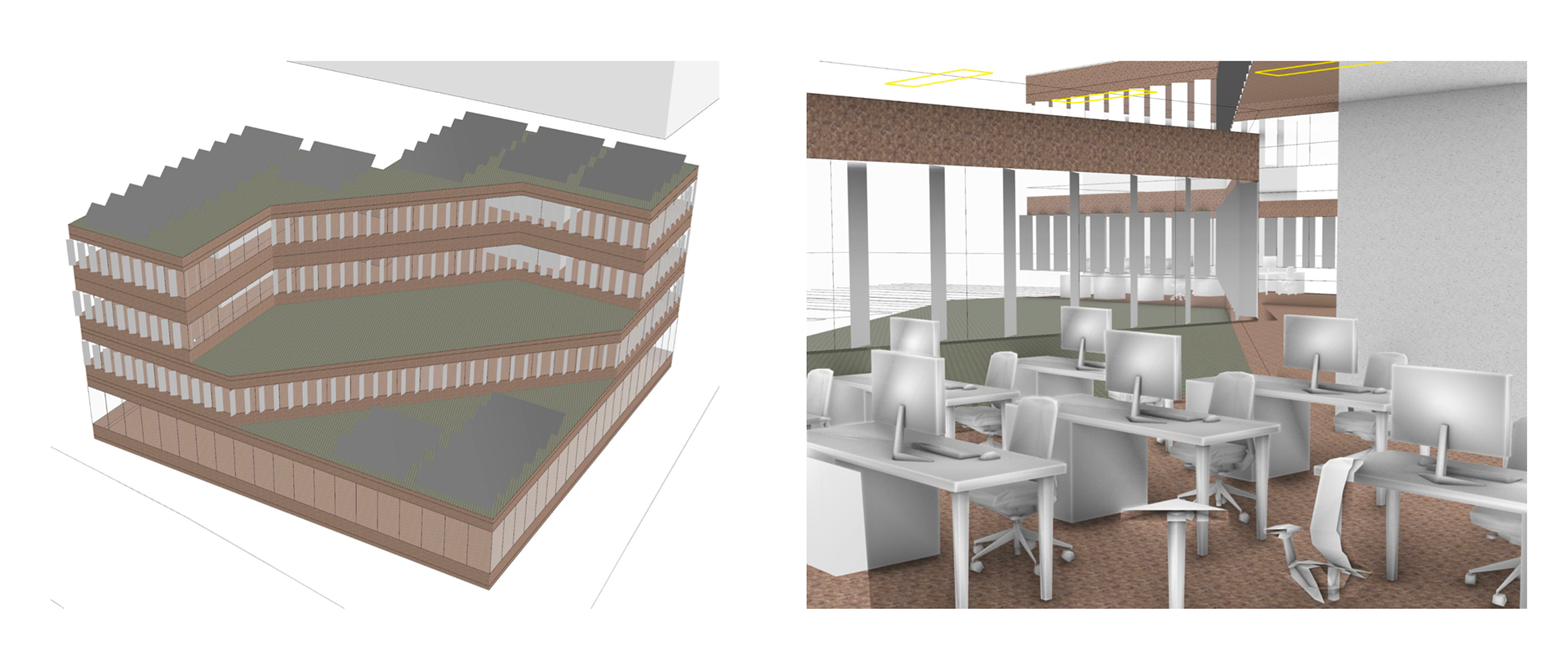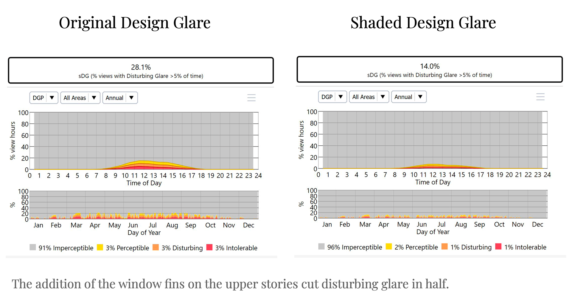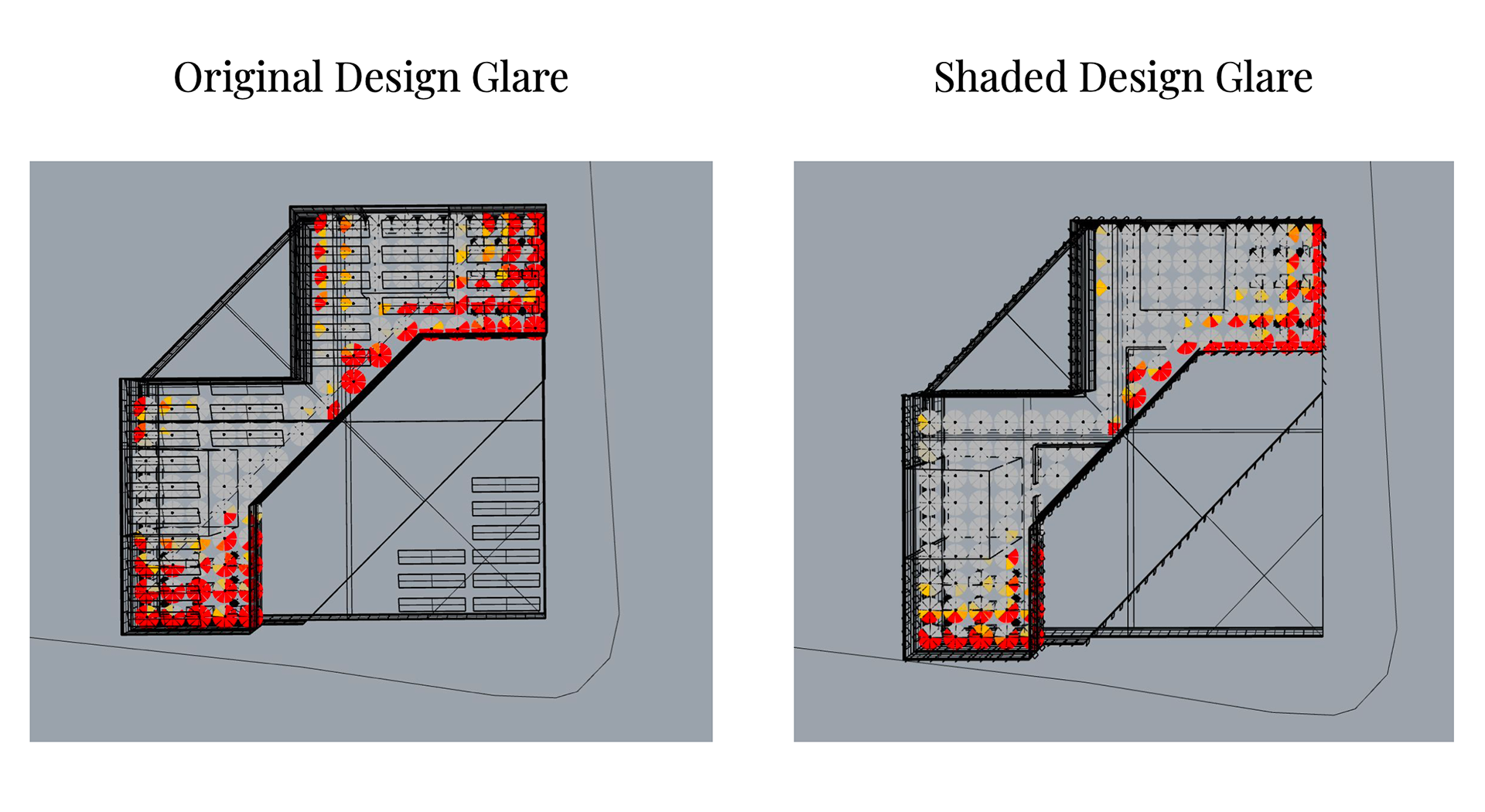After settling on a design, we conducted a glare study and implemented a shading device to reduce glare. We decided to add fins to the windows, which worked very effectively.