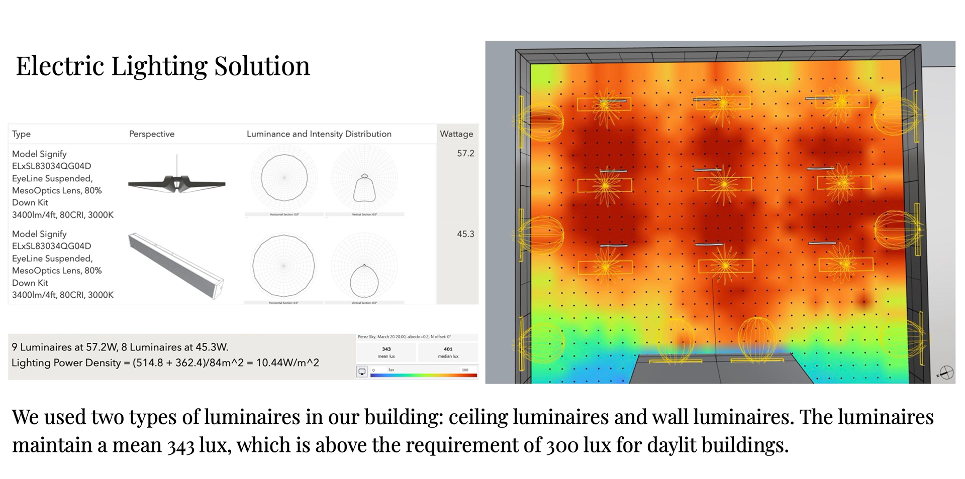 Next, we selected luminaires to achieve the minimum of 300 lux inside the building.