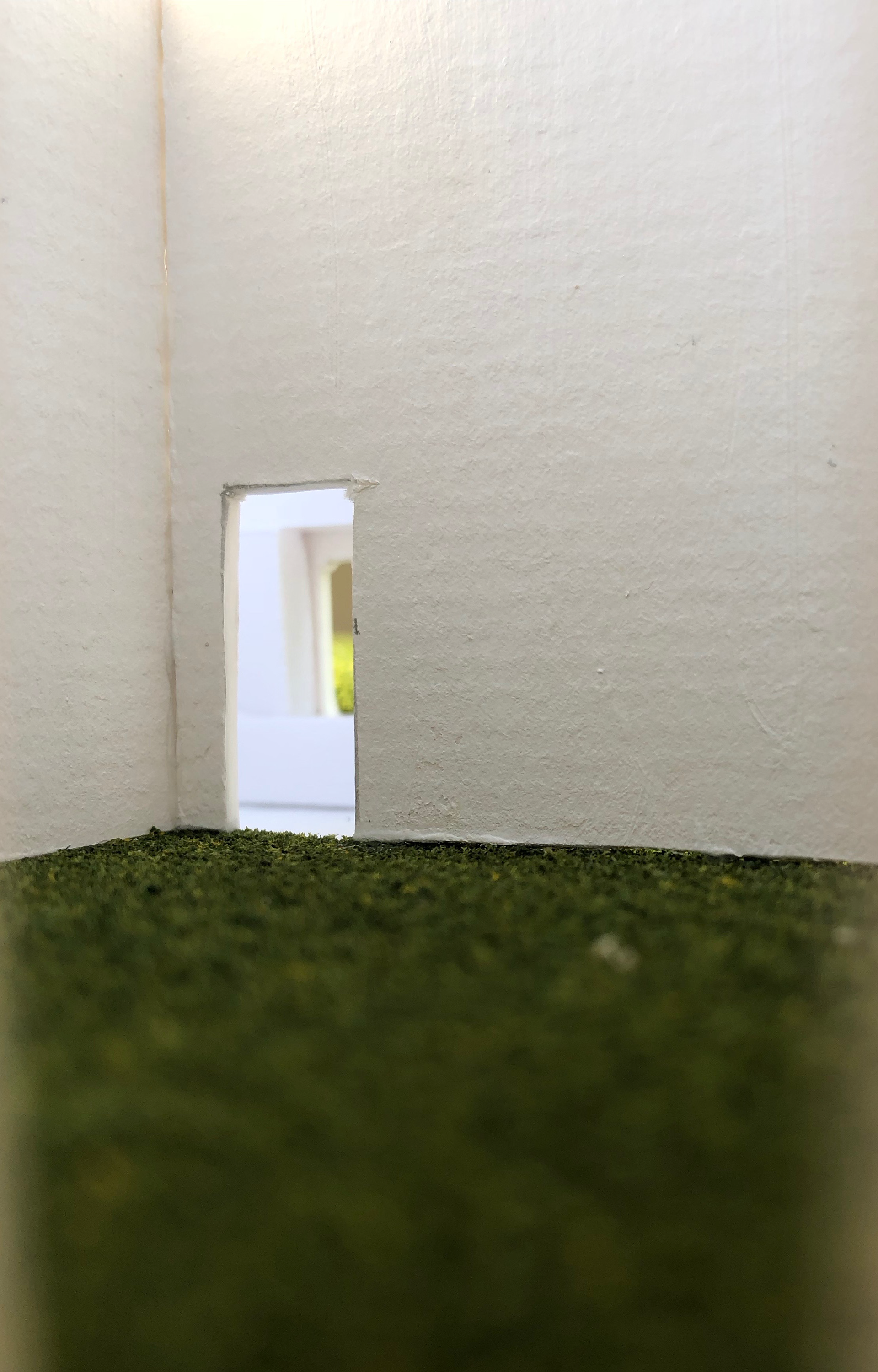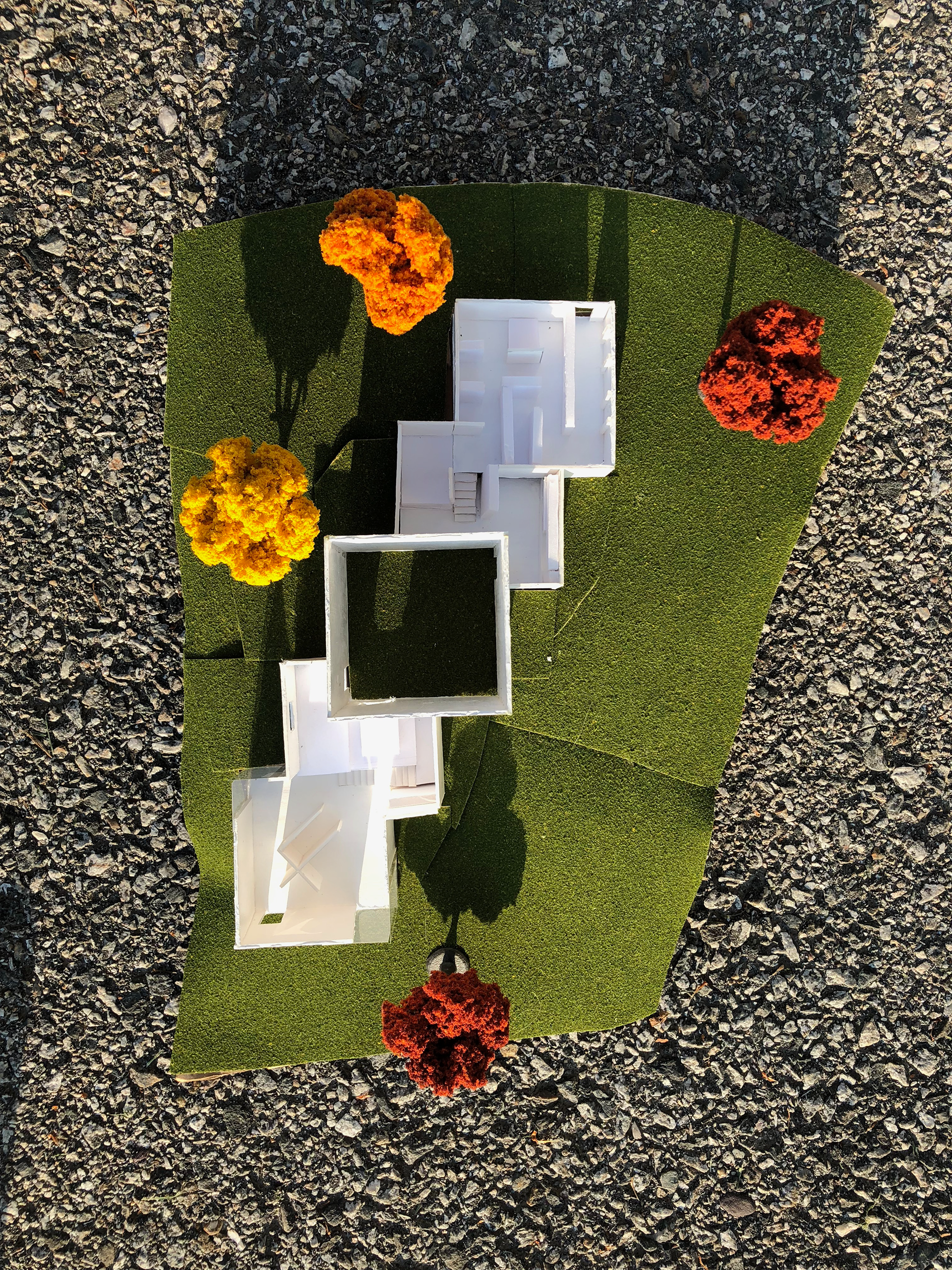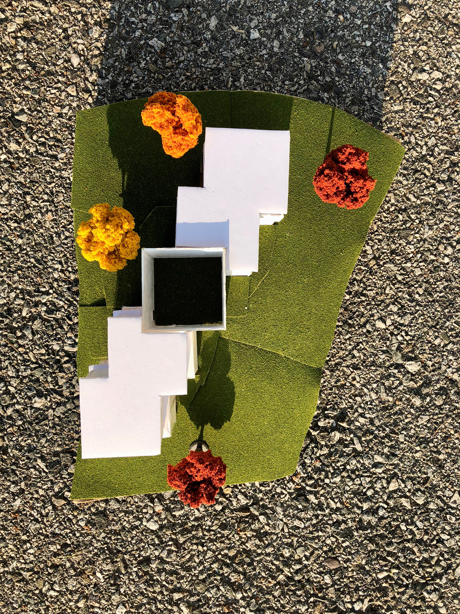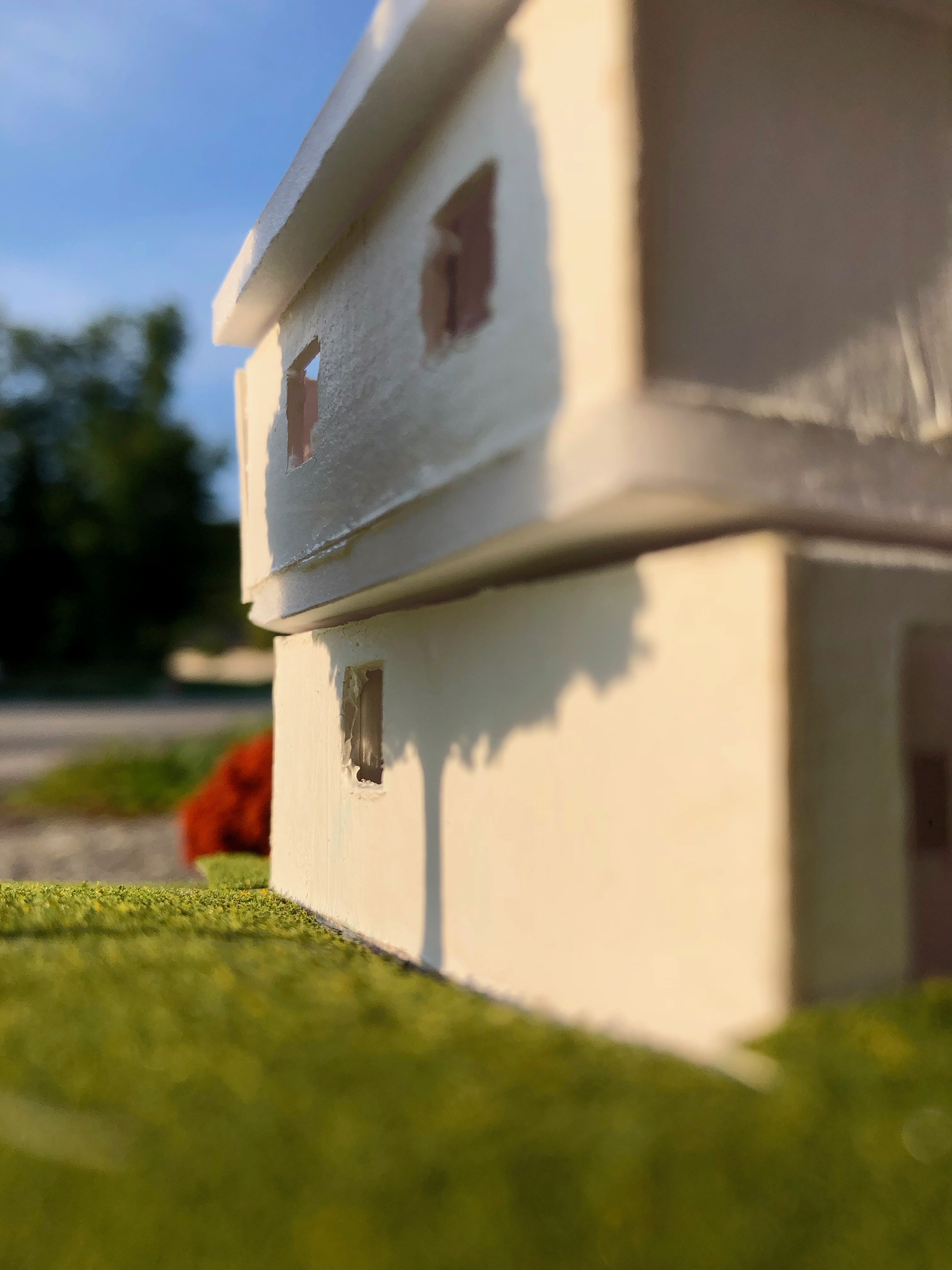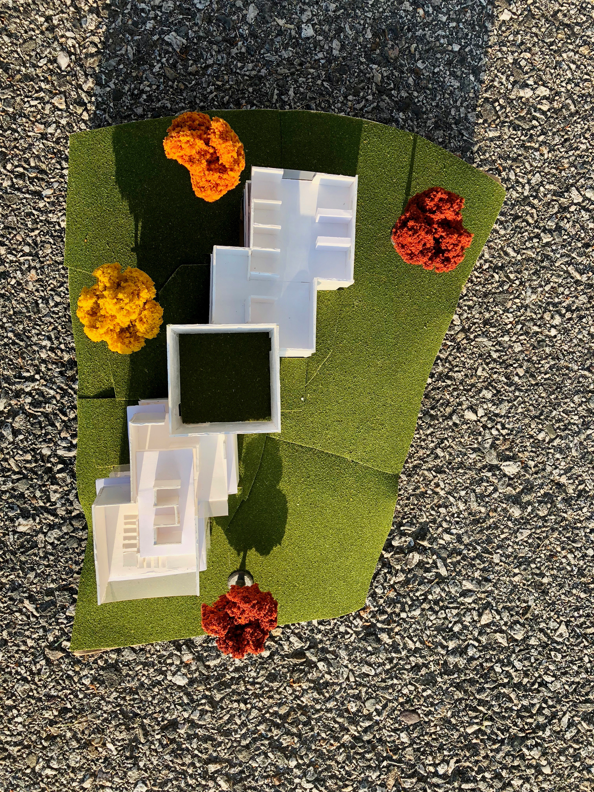 I completed this project from home, because I got very sick during the school year and had to complete my work over the summer. It was fun to work with my Professor one-on-one, but building my model proved to be very challenging without access to studio. You cannot see underneath the green material I used to represent grass, but I was required to model the precise topography of the site I was given by layering almost forty chipboard shapes cut to the exact dimensions of the site's contours. Most students used a laser cutter to do this, but because of my situation, I had to cut each layer by hand. I also cut into the topography again in order to have my house rest about four feet to scale into the earth. Due to the enormous effort it required, this is my favorite model in my portfolio. The process greatly improved my skills in cutting chipboard and foam core cleanly and accurately, and although it has its flaws, I am proud of the finished product.