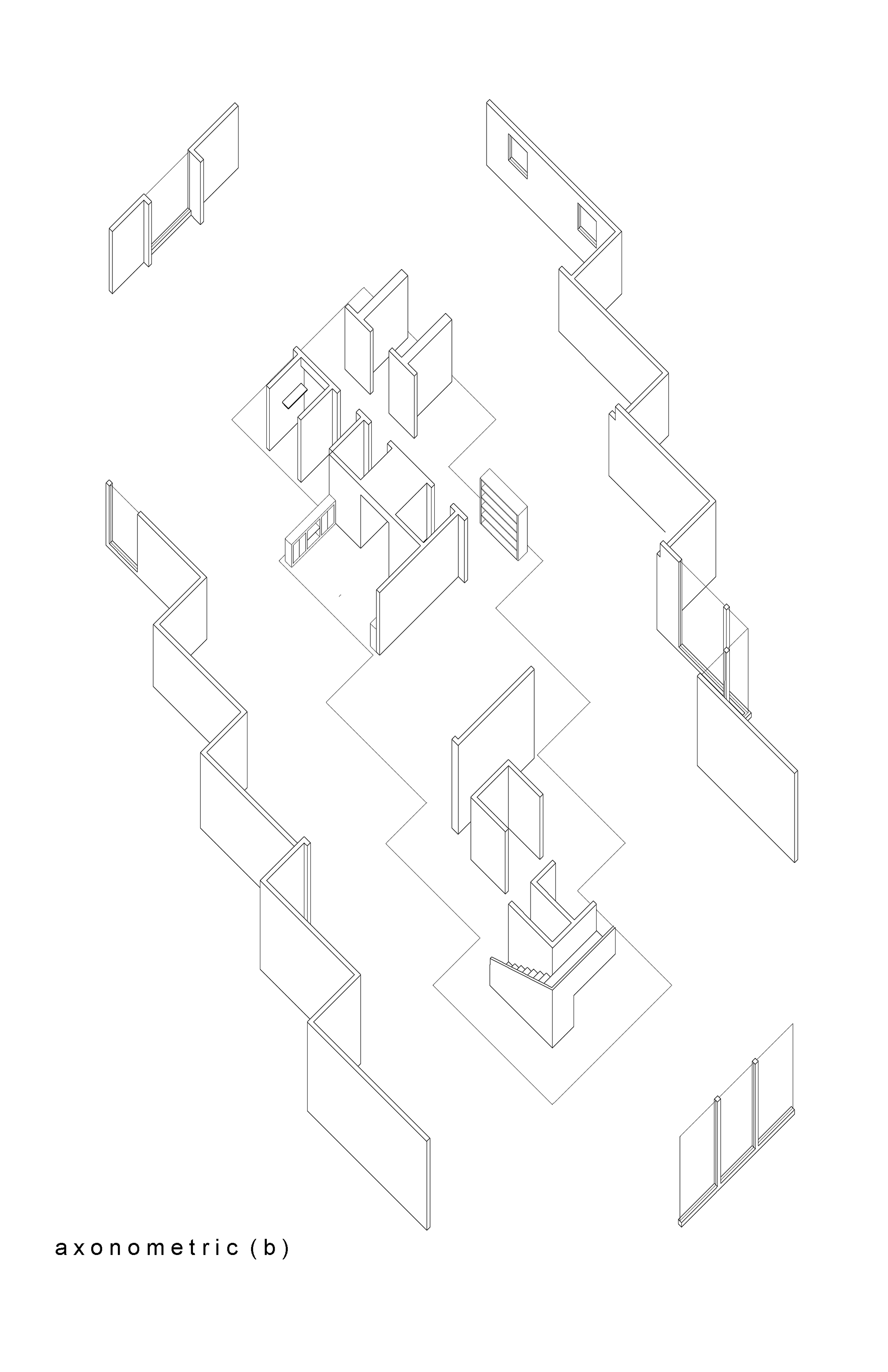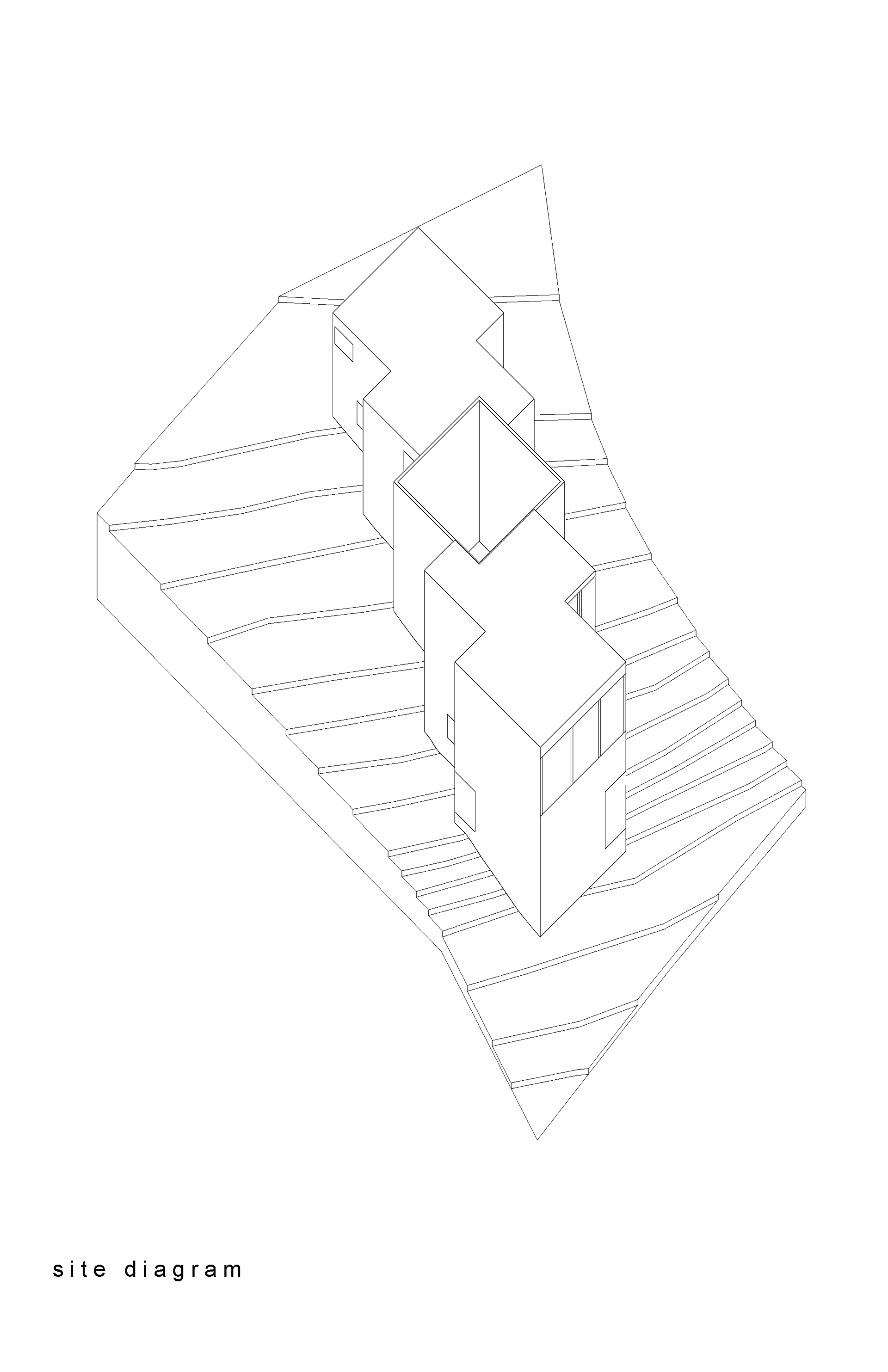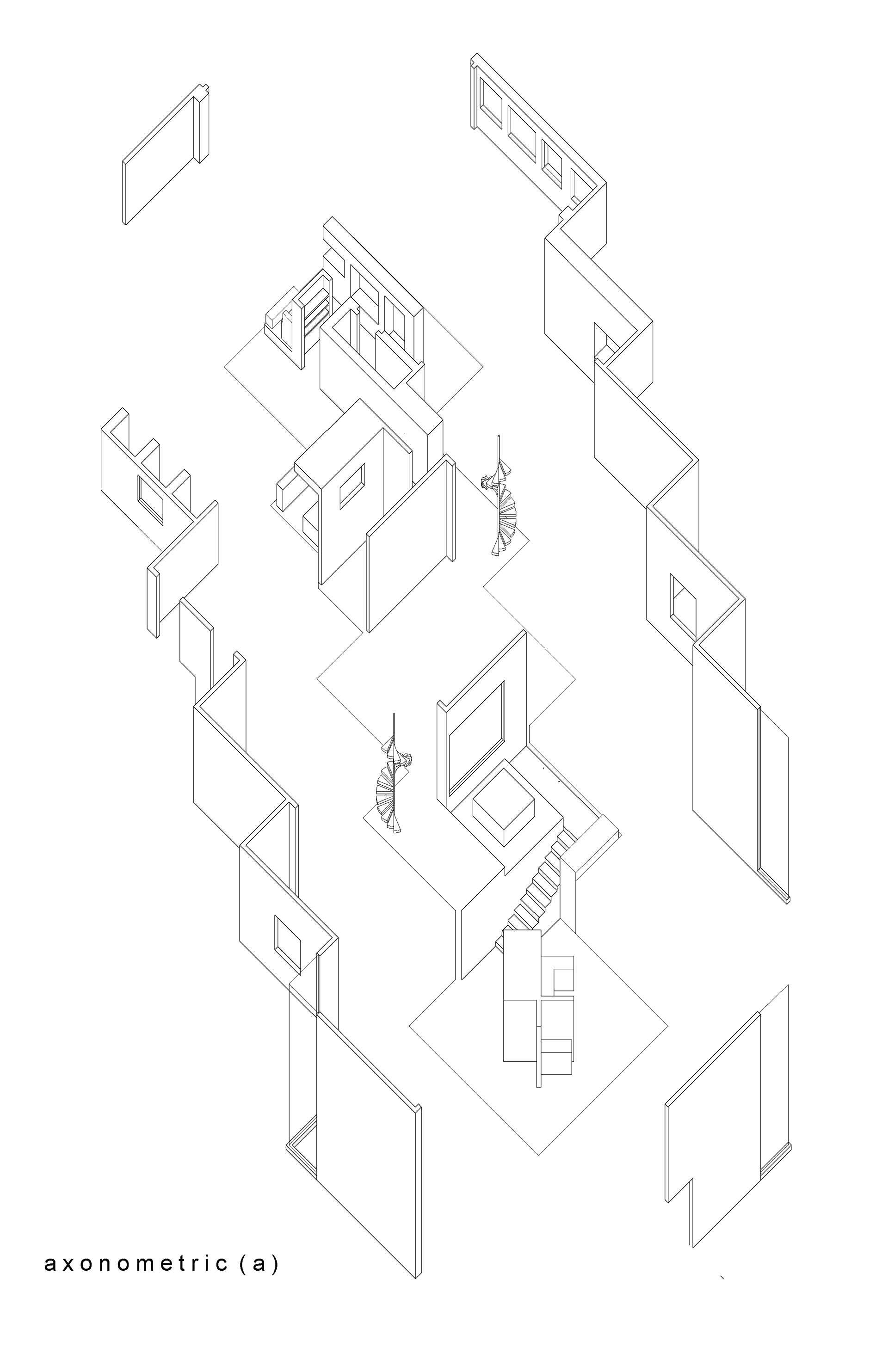 I designed this two-family house imagining that it would house two different kinds of artists: on one side, I pictured a musician, and let that guide my design for the plan, which resulted in a lot of open space and some raumplan elements; on the other side, an photographer, or maybe a painter, which resulted in a tighter space that better reflects the thick-thin concept distinct gallery spaces on the first floor separated by long corridors, and a strict grouping of bedrooms on the second floor on one side, bathrooms on the opposite, and lounge areas tucked away in intermediate spaces.