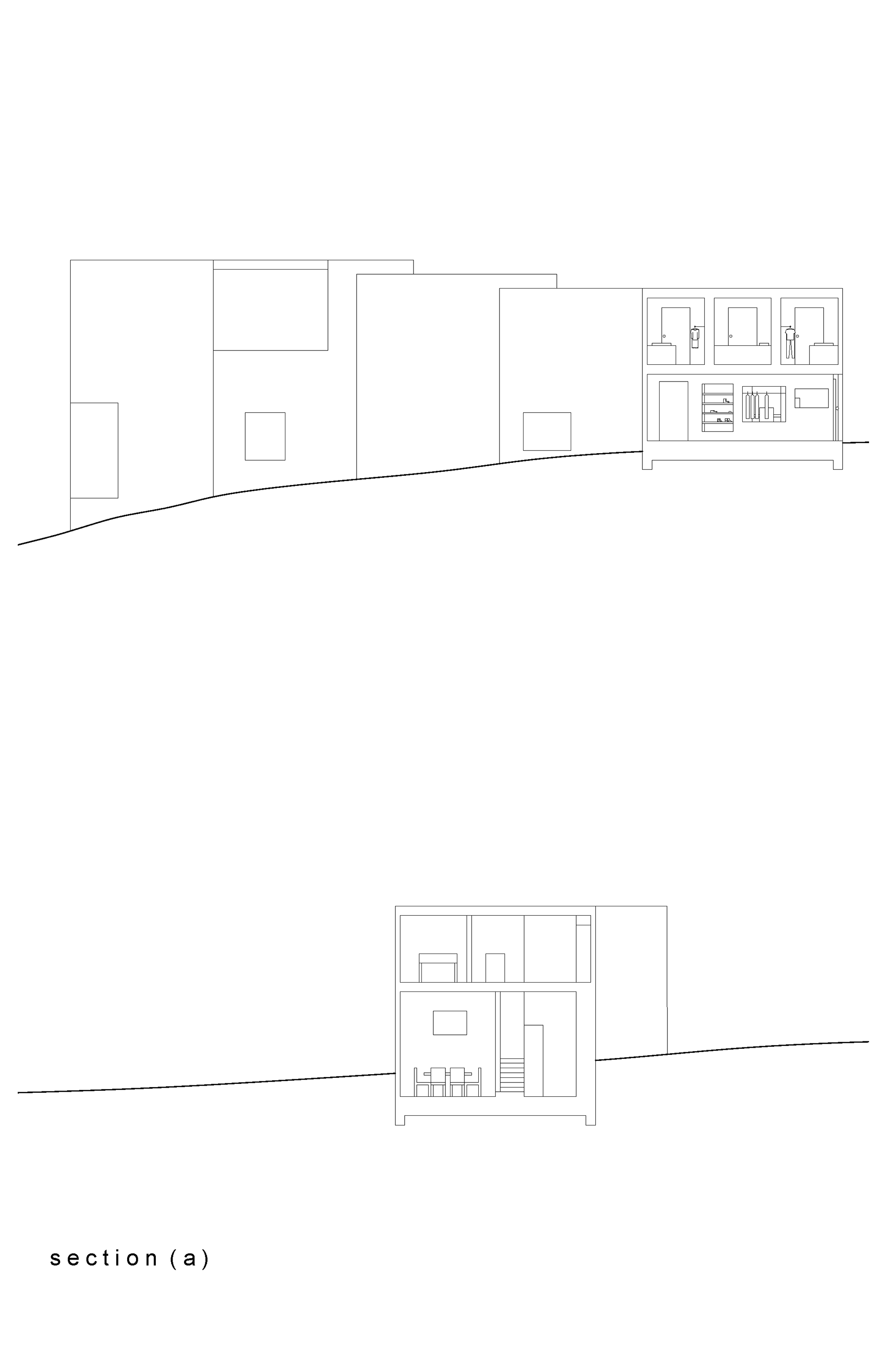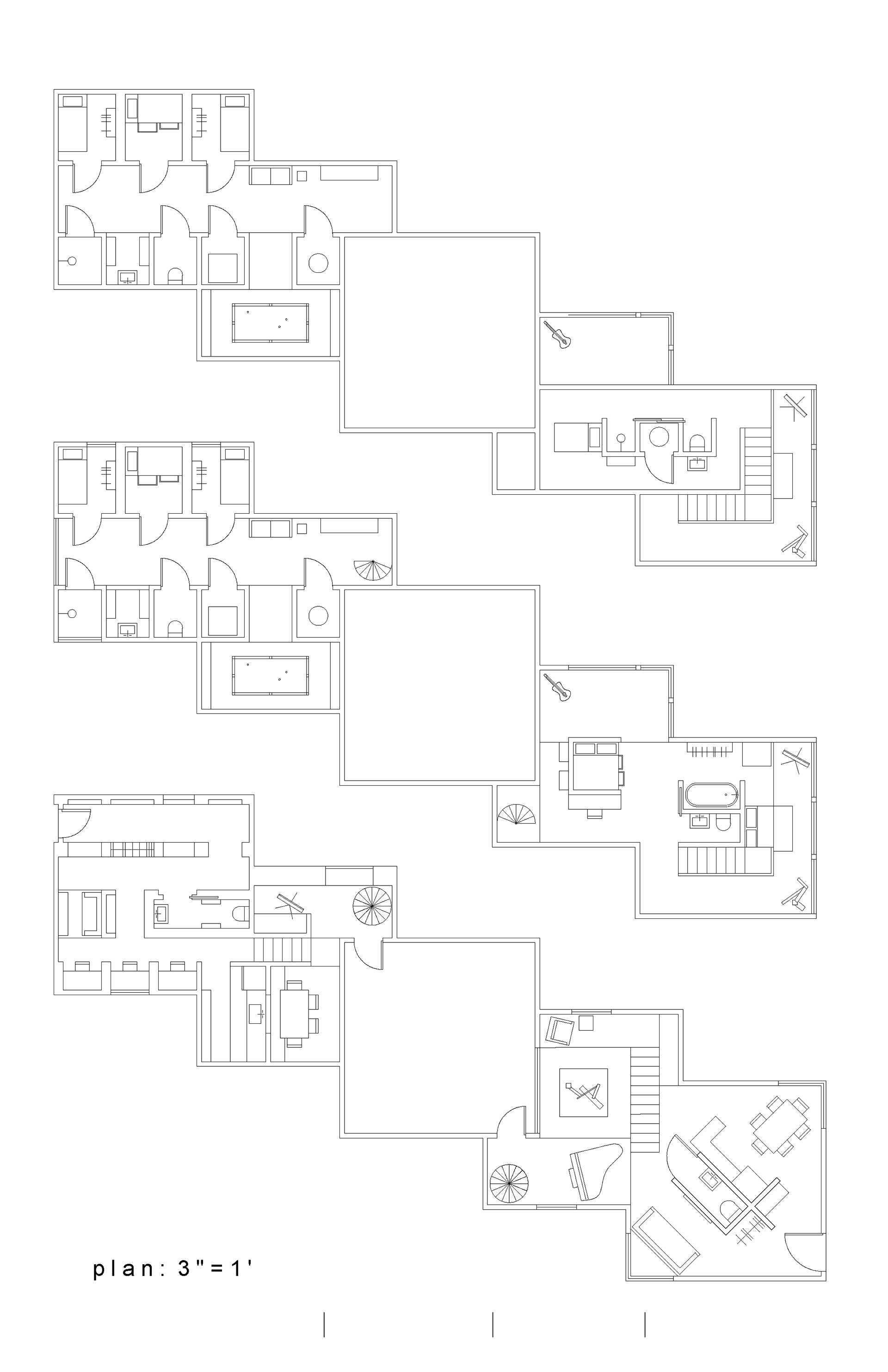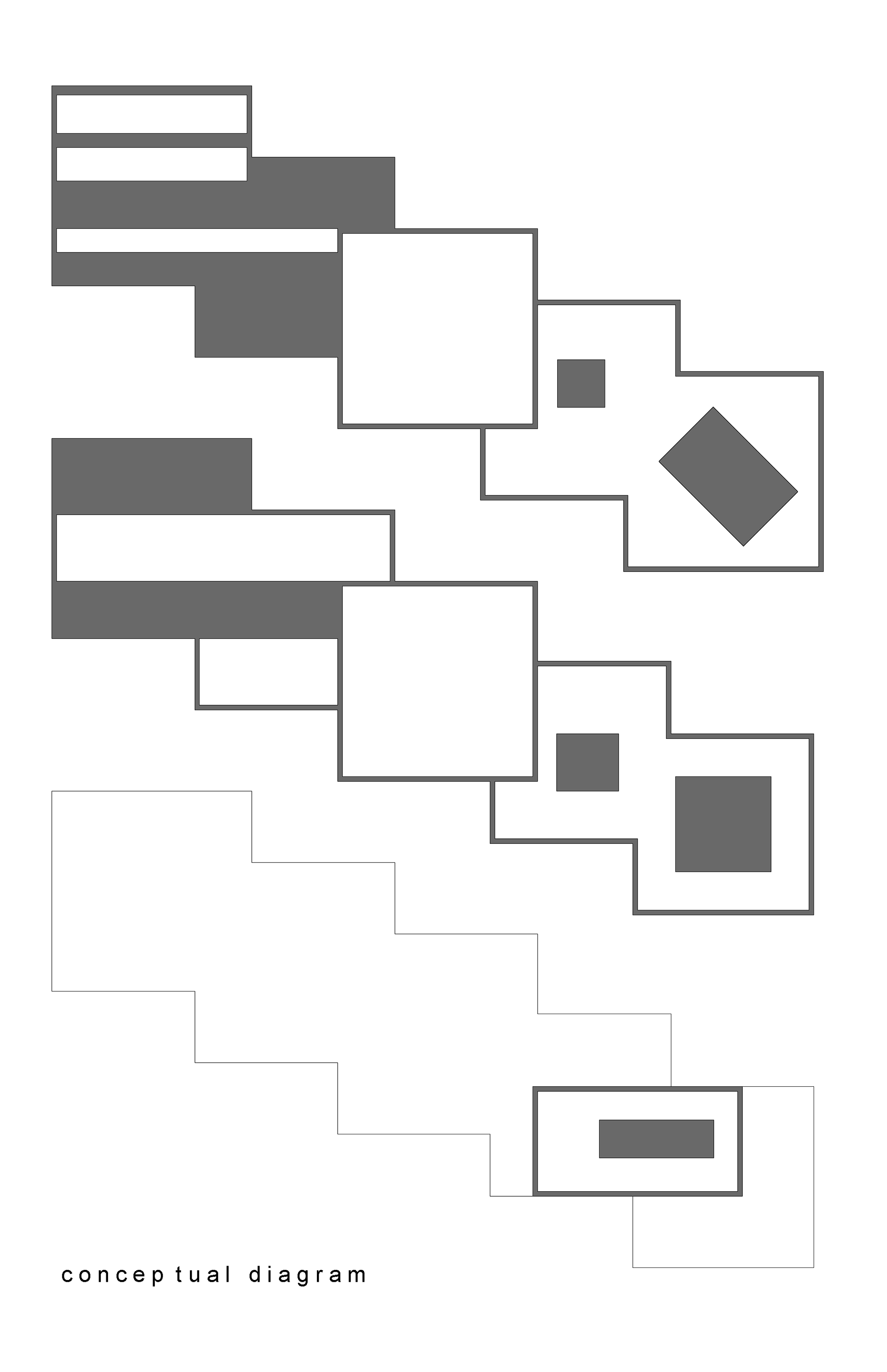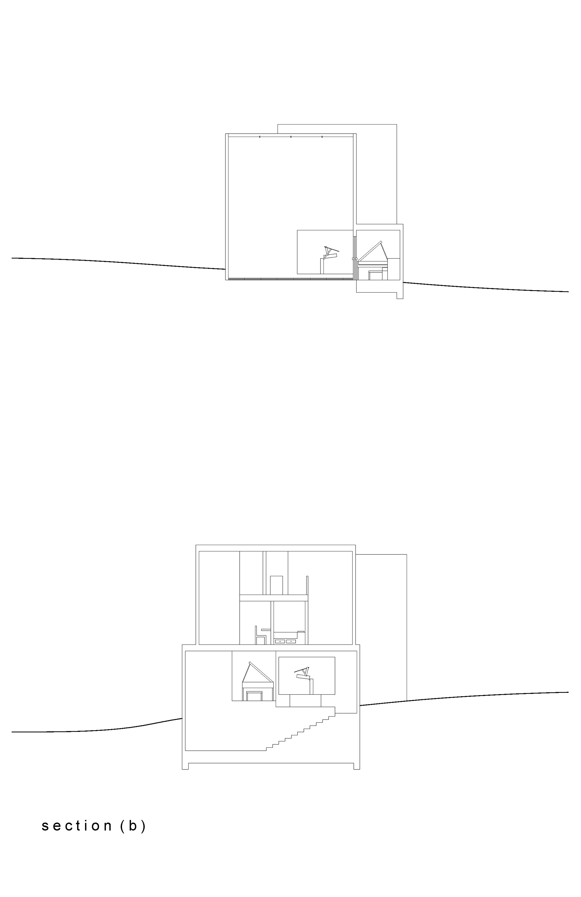 I designed this two-family house imagining that it would house two different kinds of artists: on one side, I pictured a musician, and let that guide my design for the plan, which resulted in a lot of open space and some raumplan elements; on the other side, an photographer, or maybe a painter, which resulted in a tighter space that better reflects the thick-thin concept distinct gallery spaces on the first floor separated by long corridors, and a strict grouping of bedrooms on the second floor on one side, bathrooms on the opposite, and lounge areas tucked away in intermediate spaces.