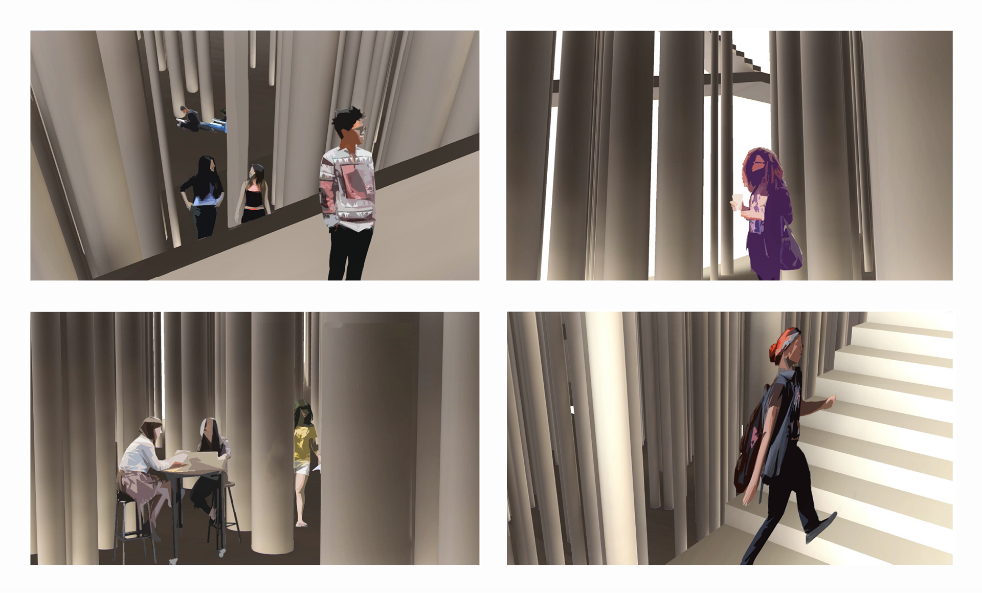 Here are renderings that begin to describe how the rigorous repetition of columns forms unique spaces within the library. I also thought it could be interesting to use the columns to store books, instead of traditional bookshelves, to encourage exploration and eliminate the need for stacks.