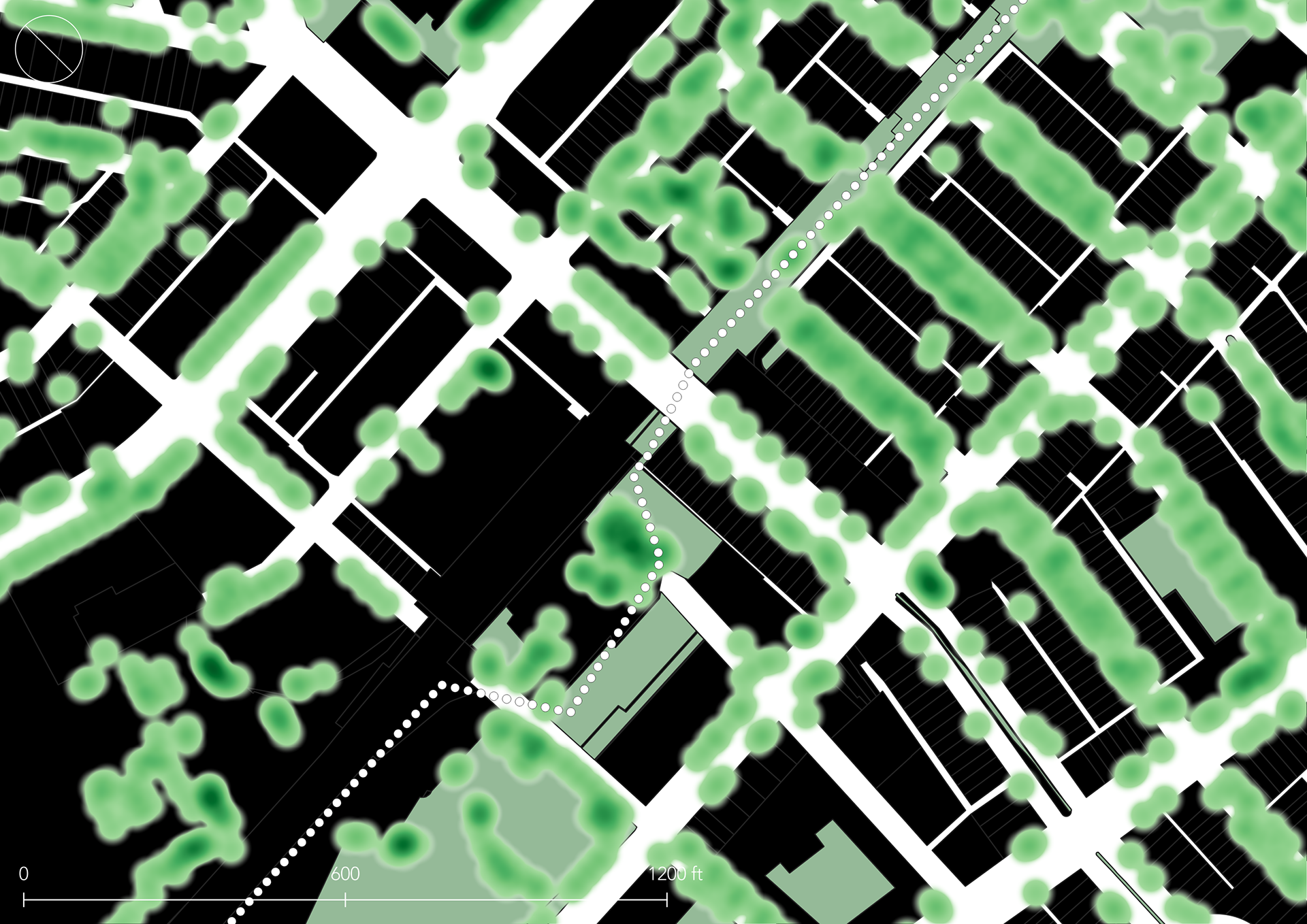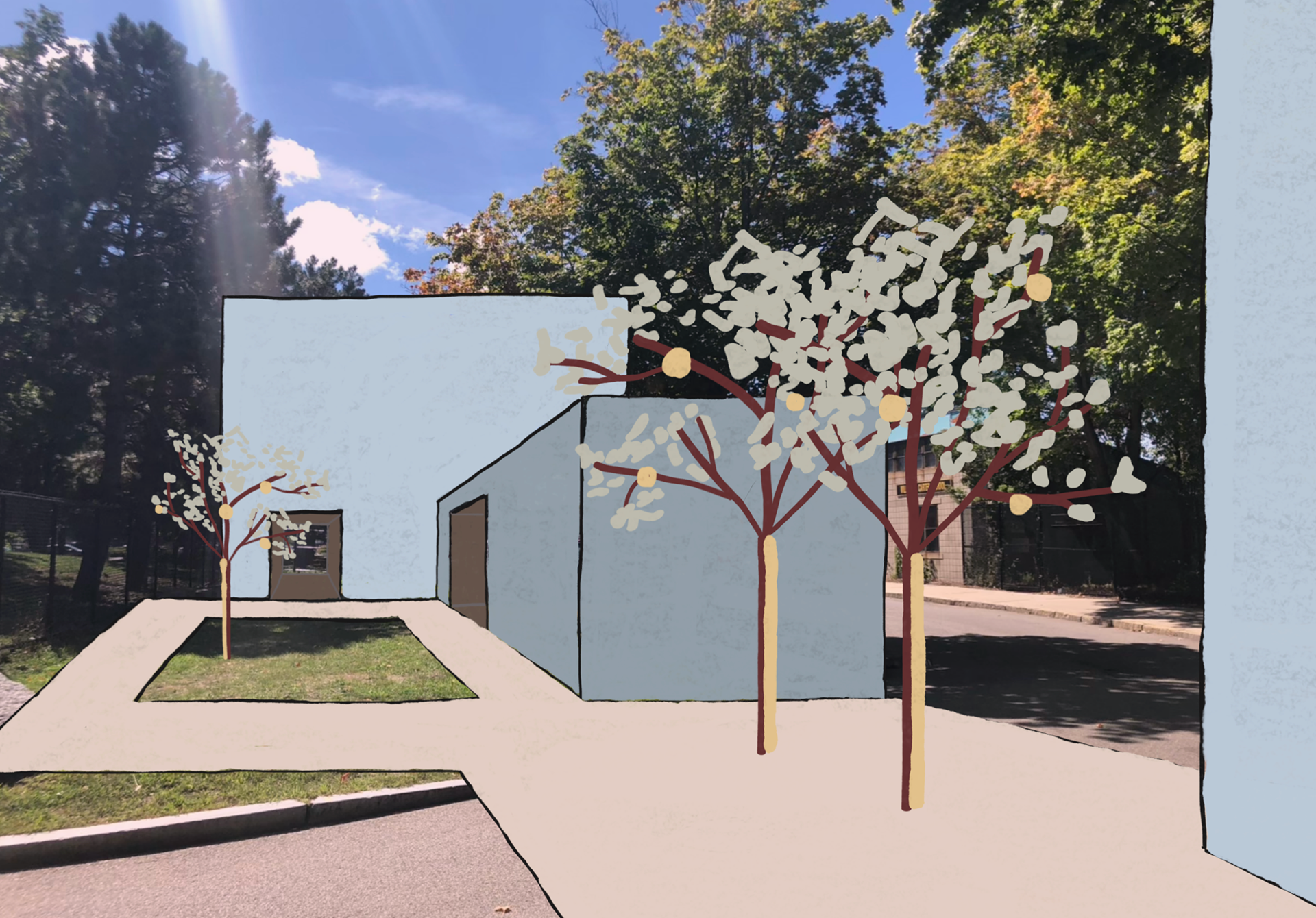 The result of my analysis was an idea for a small, simple structure in the open space between the station and the school. The main intervention would be to plant more trees in the area with lights on the branches, and add lights to existing trees as well to brighten up the space.